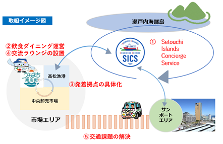 一方、JTBは、交通・観光の拠点であるJR高松駅・高松港が位置し再開発が進んでいるサンポートエリア周辺を瀬戸内及び四国の玄関口と捉え、高松漁港や瀬戸内海などの地域資源を活用した観光コンテンツ開発を行っています。また、今後の本市場の再整備を見据え、市場の賑わい創出や、瀬戸内の島々での新しい旅の過ごし方の開発と拠点設置などを検討してまいりました。