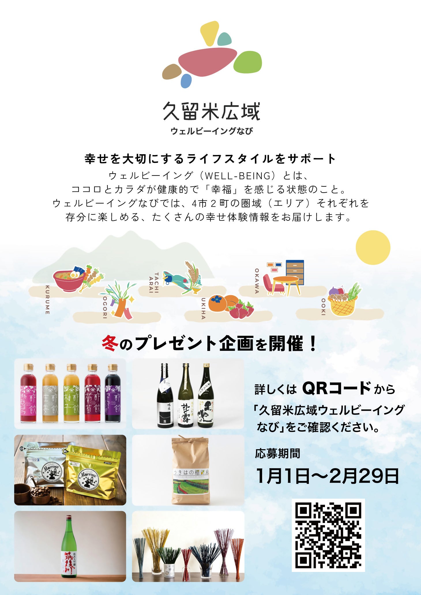 久留米市は、大川市、小郡市、うきは市、大刀洗町、大木町の4市2町で『久留米広域連携中枢都市圏』を構成しています。各市町の魅力を届けるポータルサイト「久留米広域ウェルビーイングなび」を開設し、情報発信を行っています。現在、ポータルサイト内のアンケートに回答すると圏域自慢の特産品が抽選で当たるプレゼントキャンペーンを実施中です。応募は2月29日(木)までです。皆様のご応募をお待ちしています。