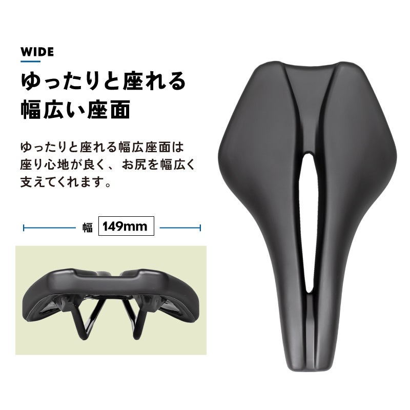 ゆったりと座れる幅広座面と、ノーズが短めで前傾姿勢をとりやすい形状が特徴のショートサドルです。