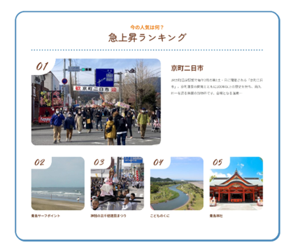 アクセスが多いページをピックアップして表示するコーナーを設け、観光スポット等も直近の閲覧状況から人気順に自動で並び変えることで、今、ニーズが高い情報を効果的に発信します。