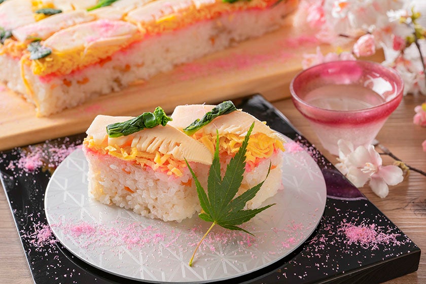 大分の郷土料理、物相ずしをアレンジした「春の箱寿司」。たけのこや菜の花など春を感じる食材を使い、