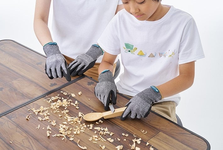 また、グローブ中指先端から下端までの長さが約22㎝のLサイズから約17㎝のXSサイズまで4種類のサイズをラインアップしています。小さな子どもから大人まで着用できる幅広いサイズ展開のため、親子やパートナーでお揃いで着用することができます。高い安全性と細かな作業も快適にこなせるので、キャンプやブッシュクラフトなどのアウトドアから園芸、DIY、などさまざまなシーンで活躍します。