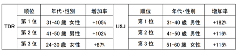■年代別はTDR、USJともに18-23歳の女性が半数以上を占める、30代は伸び率大
