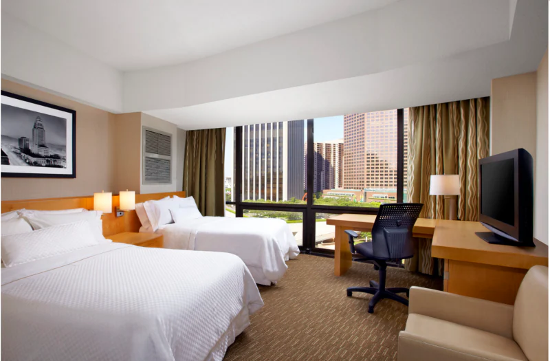 お部屋はシンプルで清潔感あふれており、ウエスティンならではのヘブンリーベッドで快適な眠りを提供してくれます。ホテル内約42のショップやレストランがあり、最上階の回転カクテルラウンジは360度夜景が楽しめることで有名。ガラス張りの円錐系型は特徴的で「トゥルーライズ」など多くの映画に使用されています。