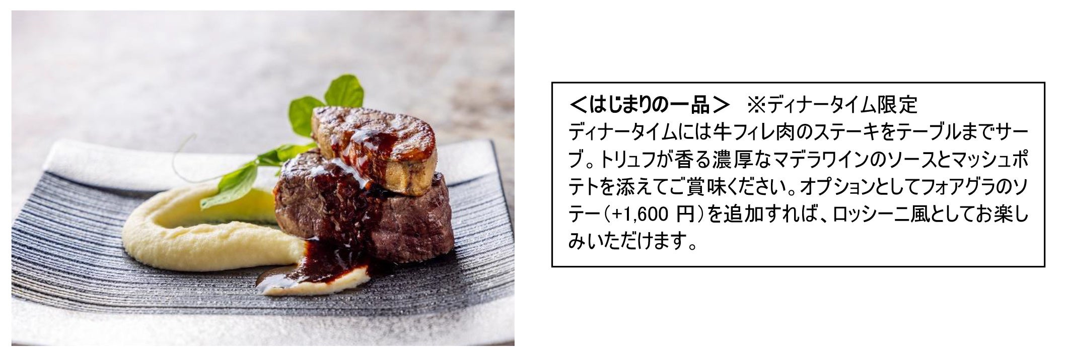また、ディナータイムにはトリュフが香る「牛フィレ肉のステーキ トリュフソース」をテーブルごとにお持ちいたします。オプションでフォアグラをご注文いただければ贅沢にロッシーニ風ステーキとしてお召しあがりいただけます。