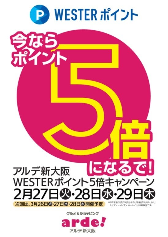 2月27日(火)~2月29日(木)までの期間中、アルデ新大阪でWESPOアプリまたはWESTERアプリを提示してポイントをためると、通常は110円(税込)で1ポイントのところ、110円(税込)で5ポイントたまります!!