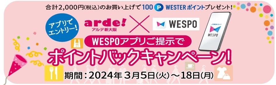 3月5日(火)~18日(月)までの期間中、アルデ新大阪のキャンペーン対象店舗で2,000円(税込)以上お買物・お食事いただくと、WESTERポイント100ポイントをプレゼントいたします!!