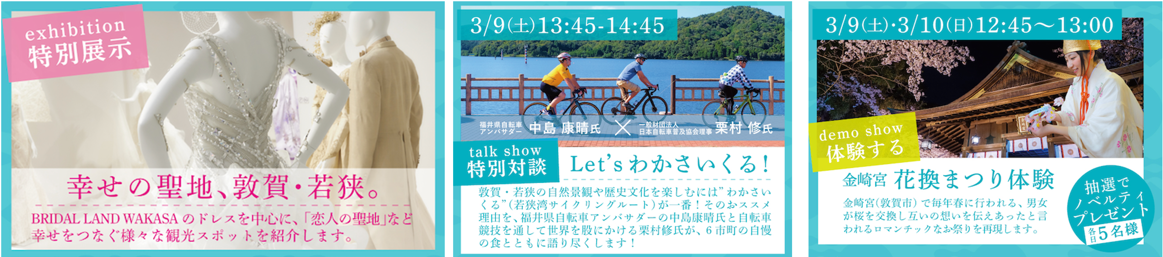 また、敦賀・若狭には【金崎宮】【常宮神社】【若狭一の宮】といった、縁結びなどで有名なパワースポットがあることでも有名です。他にも若狭には日本初のブライダルファッションミュージアムがあることから、今回のイベントでは敦賀・若狭を「幸せの聖地」と称し、パートナーと幸せを育むことが出来る場所としてアピールしています。展示ブース「幸せの聖地」には、ブライダルファッションの第一人者である「Yumi Katsura」のウェディングドレスが展示されており、結婚式の幸せなひとときを体感いただけるエリアです。