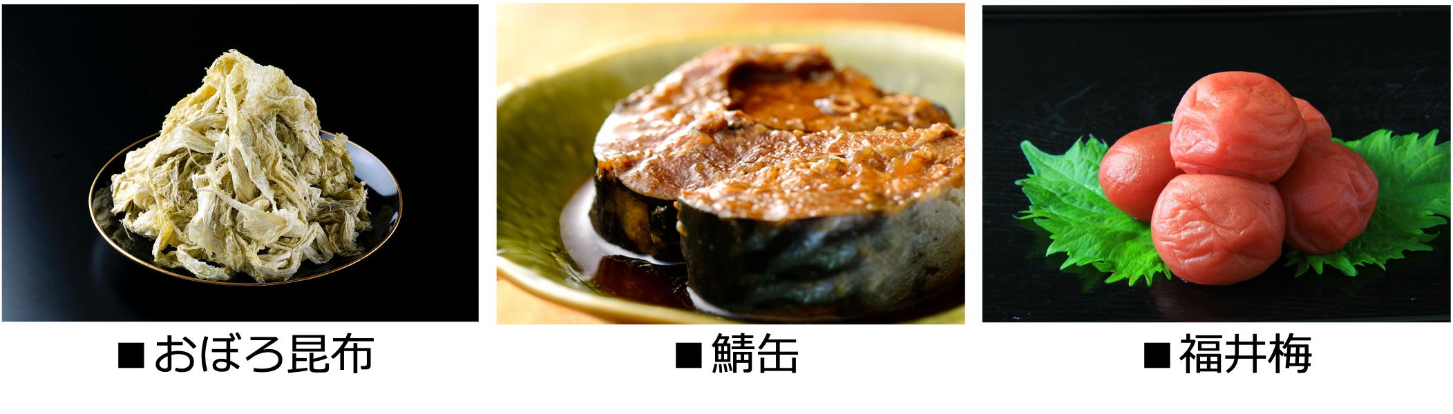 敦賀・若狭は、古くから「御食国」として塩や海産物など豊富な食材を都に運び、都の食文化を支えてきた場所です。昆布、へしこの加工品、鯖缶、福井梅など、ご当地グルメ=若狭もんを限定販売する「先取り物産展」を開催いたします。(下記は一例です)
