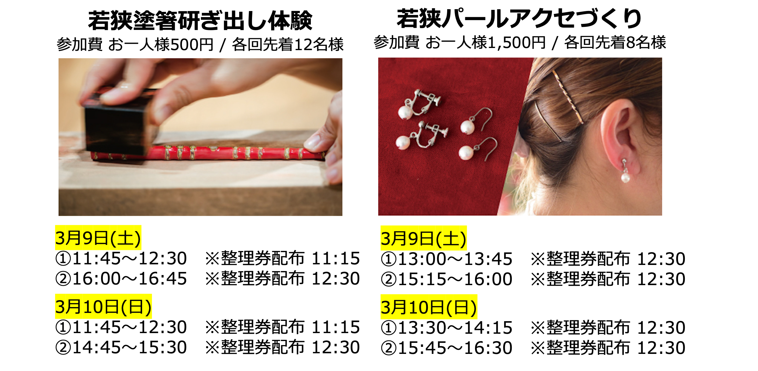 「青々吉日 敦賀・若狭フェア」では、敦賀・若狭の伝統工芸を体験できるイベントも開催いたします。日本一の箸の生産量を誇る小浜市で作られている「若狭塗箸」の研ぎ出し体験や、真珠が育つ日本の最北端ともいわれる若狭の海が育んだ「若狭パール」を使用したアクセサリー作りなど、敦賀・若狭の伝統的な手仕事を体験いただけます。