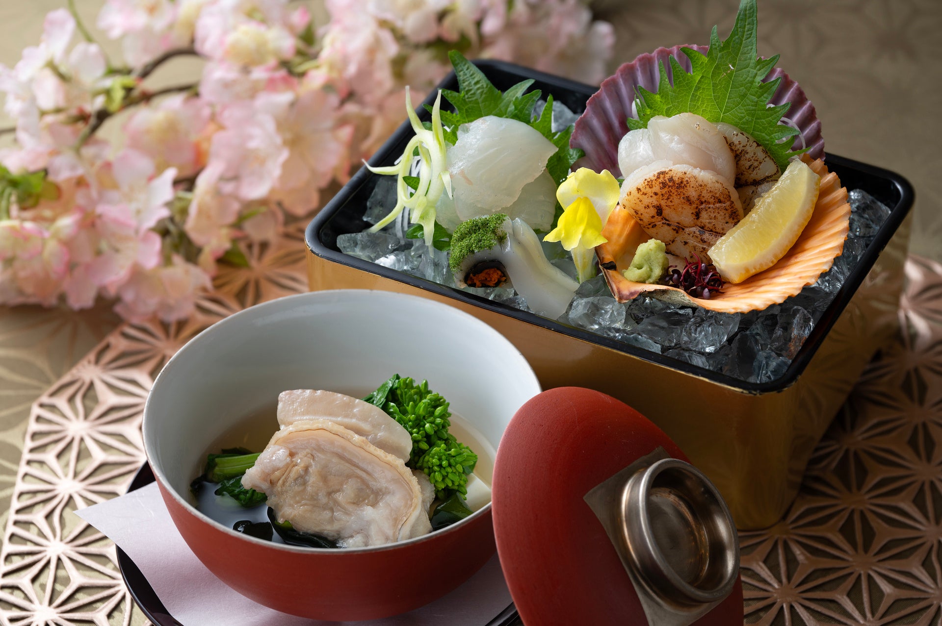 随所に旬野菜や山菜を取り入れ、春の訪れを感じさせる三重フェアのフルコースでは、マイヤーレモンの爽やかな香りと青さ海苔の磯の風味が旨味を引き立てる南伊勢町産シマアジのマリネや、桑名を代表する蛤と伊勢真鯛が贅沢に味わえる魚料理など、豊富な三重食材で春を表現しました。