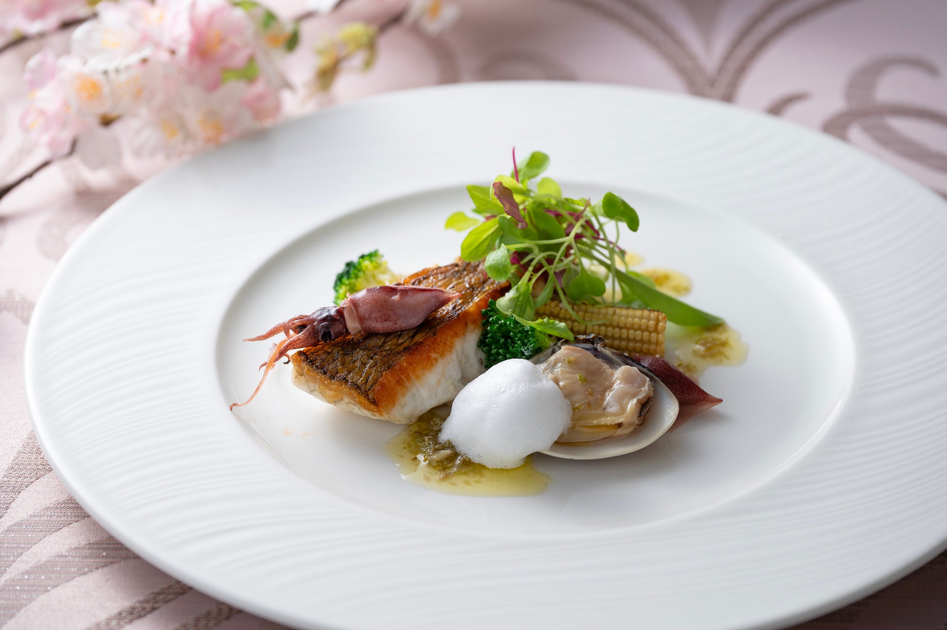 伊勢真鯛のロティと蛍鳥賊のオイルコンフィ 桑名蛤の出汁の泡 蕗の薹のソース