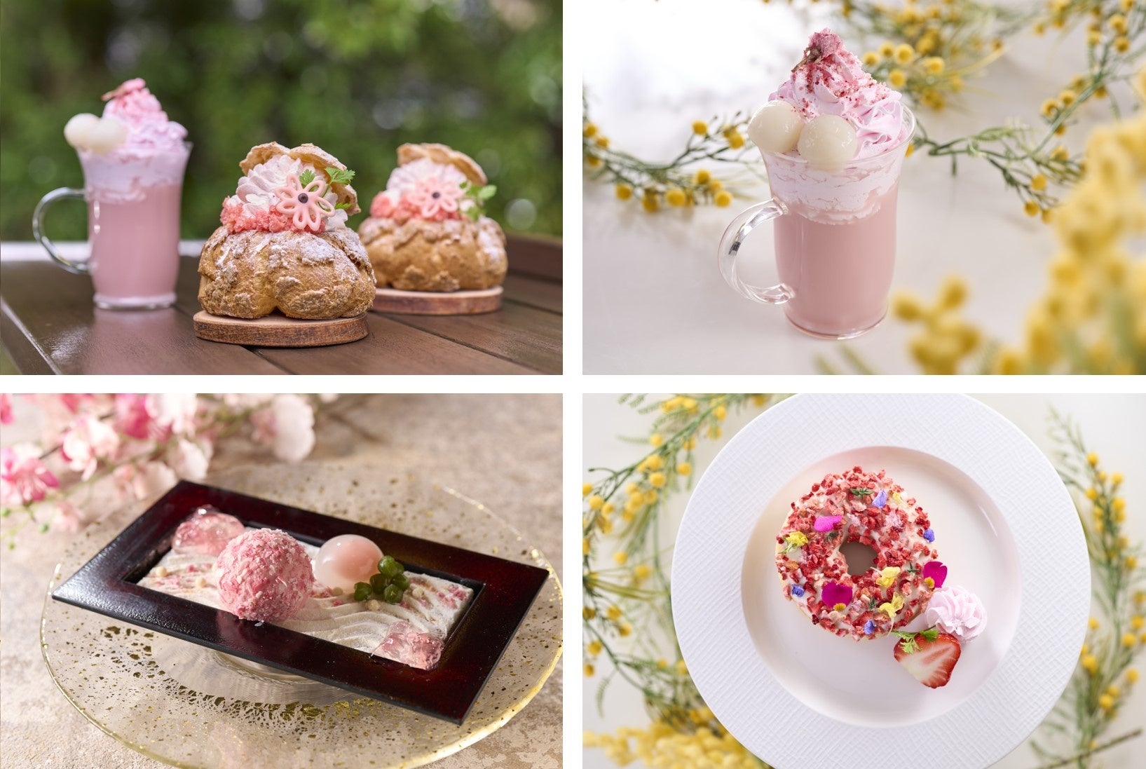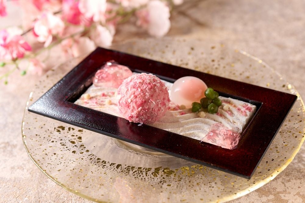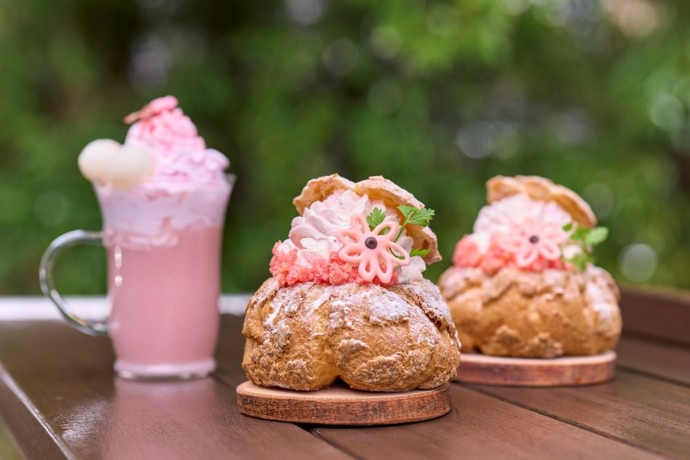 また、リソルの森の名物スイーツ「シュー・ア・ラ・クレーム」と「箱庭スイーツ<枯山水>」にも、この春限定の桜フレーバーが登場。「シュー・ア・ラ・クレーム フロマージュ」は、北海道の乳製品を使用したサワークリームといちごのフレークを混ぜ込んだ爽やかな春の味わい、「翠州亭の箱庭スイーツ<枯山水> 〜花のたより〜」は、ドーム状に仕上げたいちごのムースに極薄のフレーク状に削ったピンク色のチョコレートをまとわせた、それぞれ春らしい一品に仕上がっています。その他、グランヴォーカフェでは、桜が舞う様子を表現した「春香る桜の白玉ラテ」や、春爛漫のお花畑をイメージした色鮮やかな「オリジナルドーナッツメルト」も提供します。