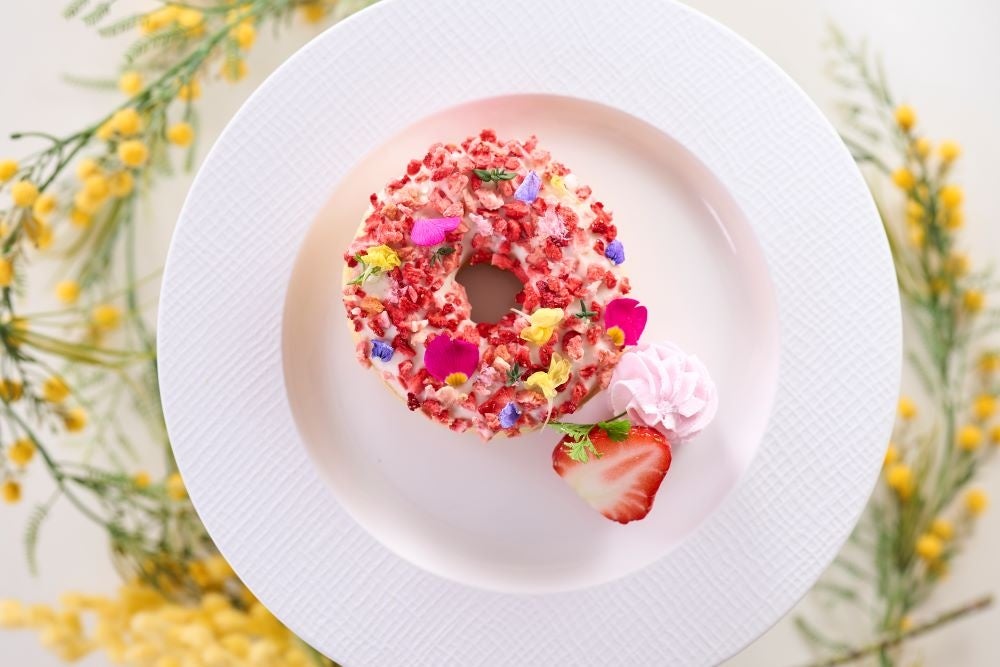 シュガードーナツにフリーズドライいちごを散らし、エディブルフラワーを添えて、春爛漫のお花畑をイメージしました。