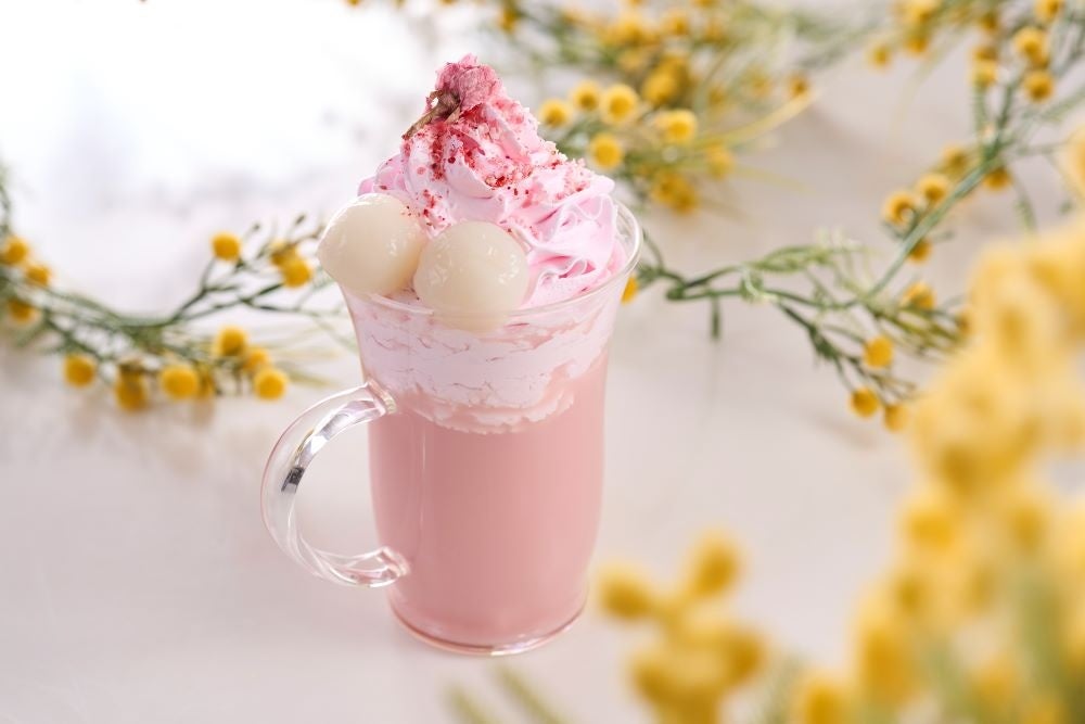 桜ラテに桜ホイップをトッピングし、白玉と塩漬けの桜を添え、ストロベリーパウダーを散らして桜が舞う様子を表現しました。華やかに香る桜の風味をお楽しみいただけます。