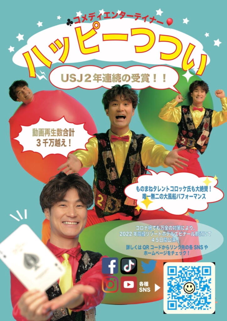 マジックを取り入れたコメディパフォーマンスで皆さんに笑顔をお届けします。そしてクライマックスではジャンボバルーンにも入り小さいお子さんから大人・お年寄りの方までとっても楽しめるハッピーなショーです!ユニバーサルスタジオジャパンで開催されたパフォーマンスコンテストにて唯一2年連続で賞を獲得!!