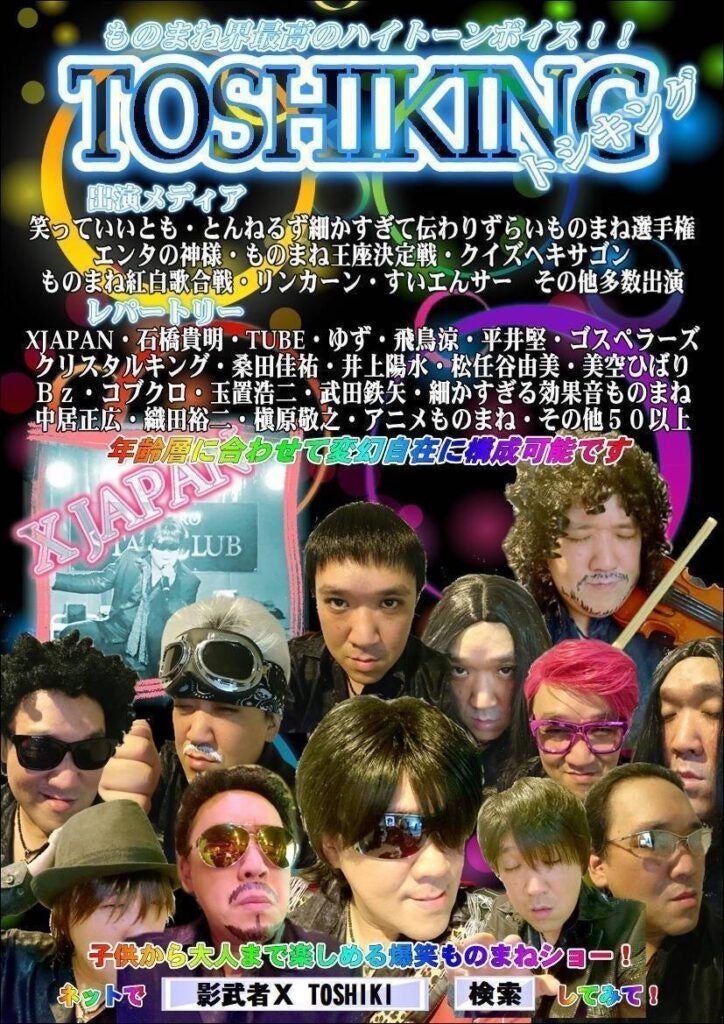 フジテレビものまね王座決定戦、エンタの神様など、数多くのテレビ番組に出演しているモノマネ芸人。モノマネ界最高の高音ボイス、XJAPAN(TOSHI)から、TUBE、B’z、ゆず、平井堅、とんねるず、どこかで聞いたことのあるあんな音やこんな音、北斗の拳など、バラエティー豊かな爆笑モノマネステージをお届けいたします!
