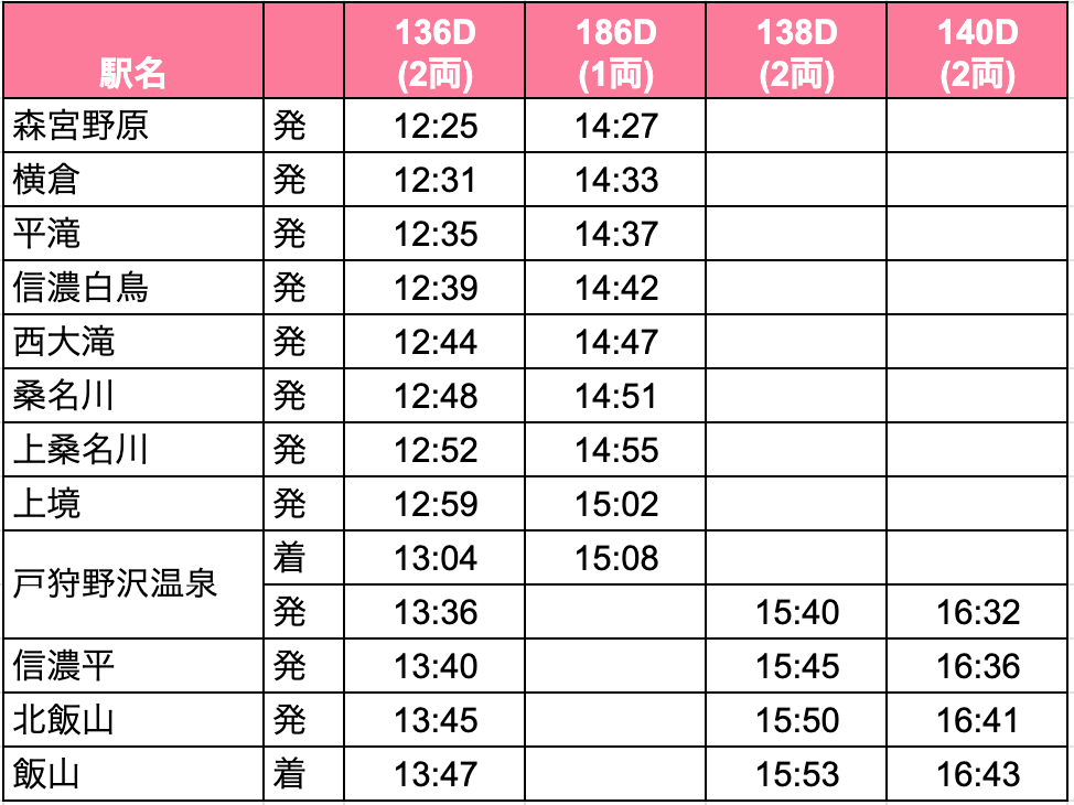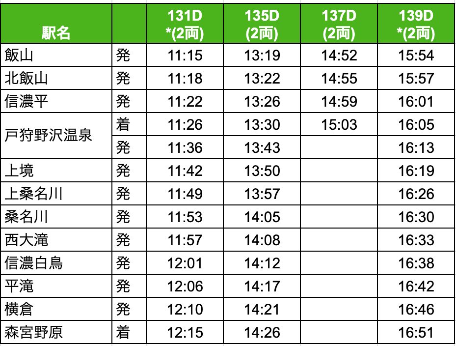 *131D(飯山駅発11:15)、139D(飯山駅発15:54)は戸狩野沢温泉駅到着後、1両目が森宮野原駅に向け運転します。上境駅〜森宮野原駅間で降車されるお客様は1両目にご乗車ください