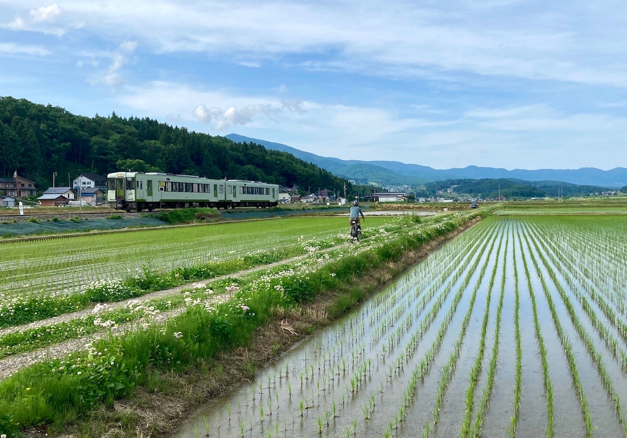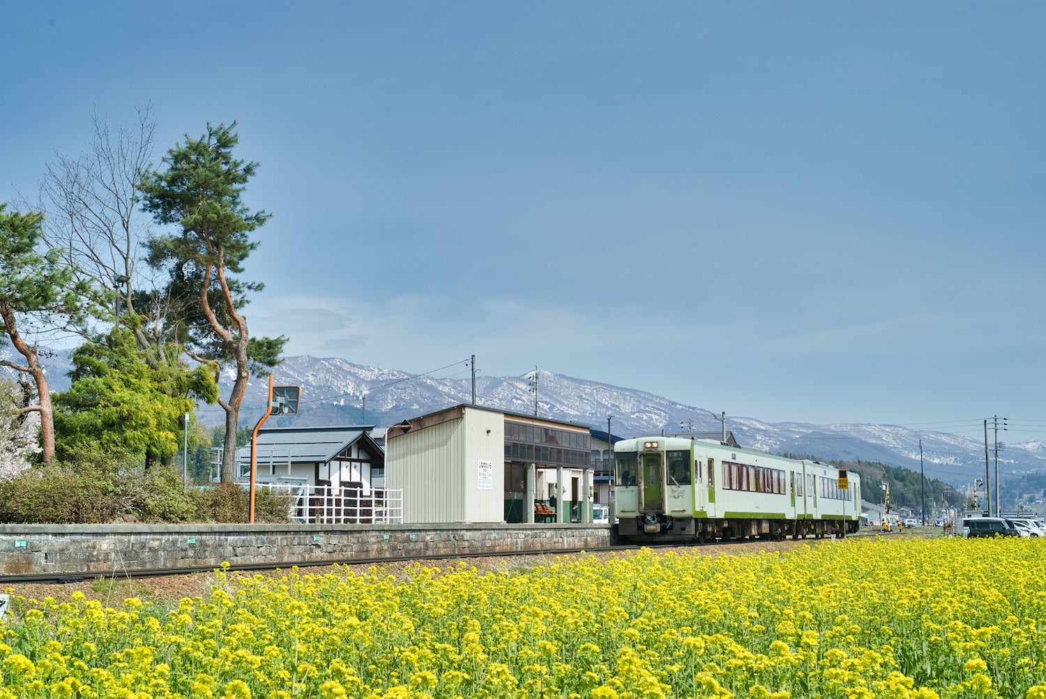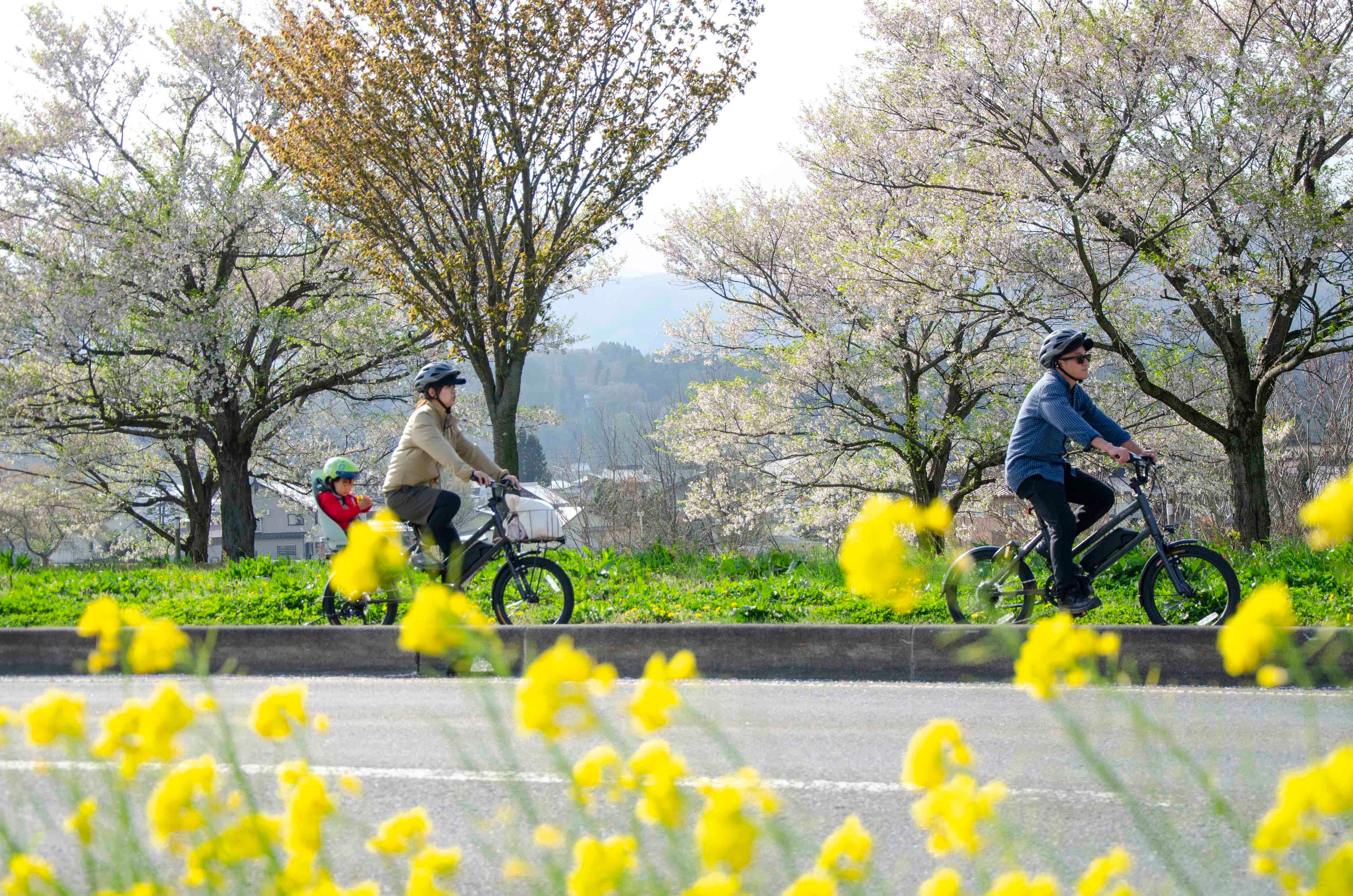 飯山駅を自転車で出発して、帰りは信濃平駅からサイクルトレインに乗る初心者向けの鉄板ルートをご紹介。道幅も広く安全な千曲川堤防沿いの道は、春になると桜並木が続く人気のお花見スポット!タイミングが合えば道路脇に菜の花も咲き、春爛漫のサイクリングロードになります。