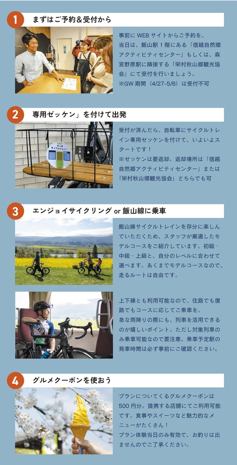 MAPを見ながらおすすめの立ち寄りスポットを自分のペースで巡ることができる、春のお出かけにぴったりなスタッフ一押しモデルコースをご提案。途中、グルメクーポンを利用して旬のグルメも楽しみます。初心者やお子様連れでも安心な千曲川沿いの桜堤を走る「桜ファミリーコース」や、日本の棚田100選にもなっている福島棚田と飯山の菜の花畑を巡る「菜の花と棚田コース」、前回人気だった飯山線フォトスポットを網羅した「撮り鉄コース」は桜スポットが追加された「シン・撮り鉄コース」に生まれ変わり、今回もバリエーション豊かなモデルコースをご用意しました!