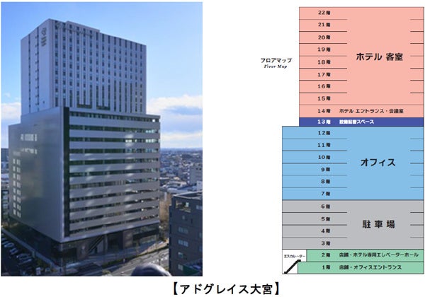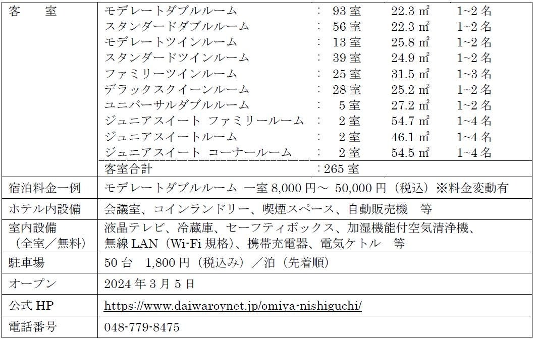 同施設の高層階には、埼玉県内最高層(約90m)(※)の客室を用意した「ダイワロイネットホテル大宮西口」(総客室数265室)が入居し、2024年3月5日(火)にオープンします。なお、当ホテルのオープンにより、当社が運営するダイワロイネットホテルは全国で77店舗目、埼玉県では初出店となります。