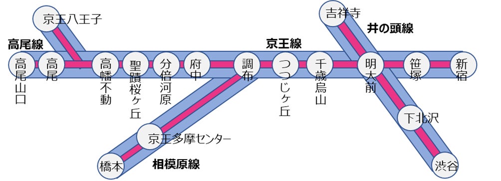 新宿(百貨店口、西口、新線口、新都心口)、笹塚、千歳烏山(北口、南口、西口)、つつじヶ丘、調布(中央口)、府中(北口、南口)、分倍河原(京王改札)、聖蹟桜ヶ丘(西口、東口、せいせき口)、高幡不動、京王八王子(中央口)、高尾(京王南口)、高尾山口、京王多摩センター(中央口)、橋本、渋谷(中央口)、下北沢(中央口)、明大前(中央口)、吉祥寺、18駅26箇所に各1台設置いたします。