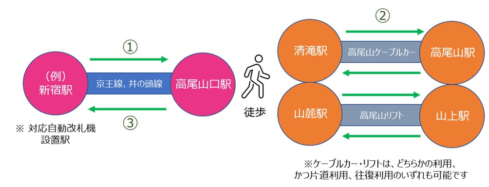 ①京王線・井の頭線の一部の駅に設置した対応自動改札機を利用して乗車し、高尾山口駅にて下車