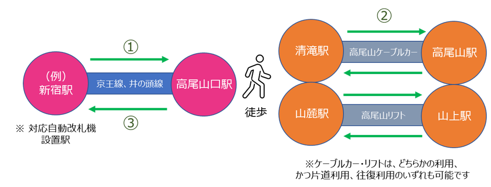 ①京王線・井の頭線の一部の駅に設置した対応自動改札機を利用して乗車し、高尾山口駅にて下車