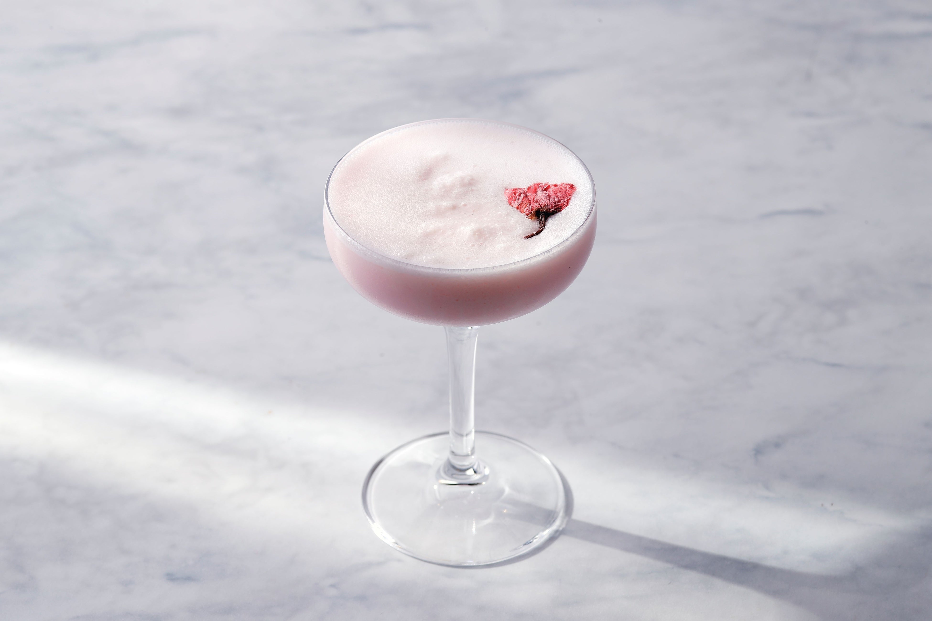 サントリーのジン「六」を使用したデザートカクテル。ホワイトチョコレートソースとミルク、ココナツウォーターを加え、シェイクすることでふわふわの口触りのカクテルが仕上がります。桜のシロップを加えた桜チョコレートミルクのデザートカクテル。桜の塩漬けを乾燥させて押し花にしたものを浮かべて可憐に仕上げています。カクテルグラスでご提供いたします。