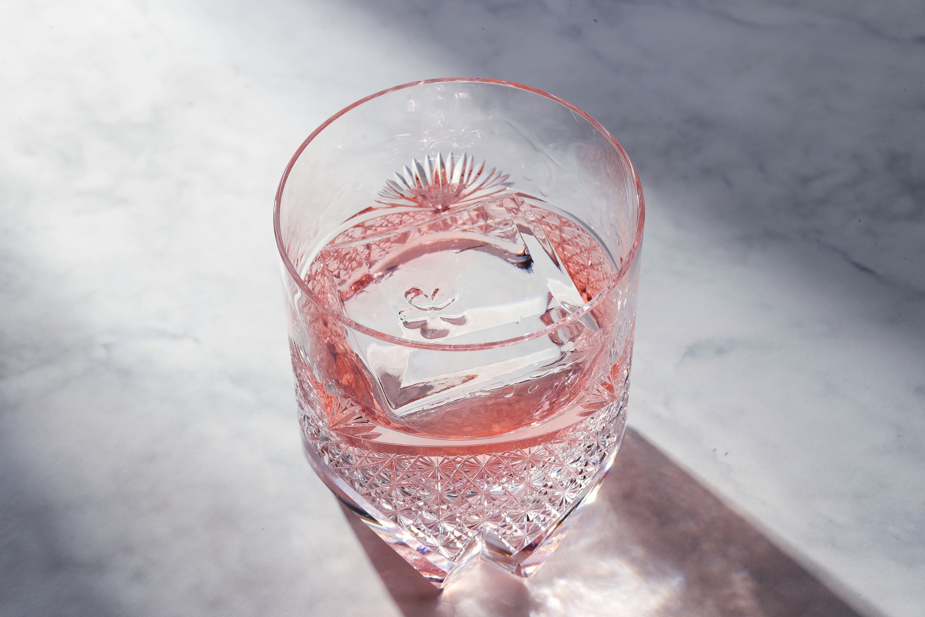 オールドファッション・ド・グラスの中で、きらめく氷が美しい、薄桜色のジンベースのカクテル。岩崎櫻子がロックアイスを包丁でジュエルカットした、クリアな輝きを放つ氷には、アイススタンプで桜を刻印。ゆっくりと溶けていく氷を眺める時間もいとおしい。京都に蒸溜所をもつ「京都蒸溜所」でつくられるジン「季の美」と、桜の香りを表現するために、花や柑橘などさまざまなリキュールを混ぜることで桜の香りを表現した岩崎櫻子オリジナルリキッドで仕上げます。リキュールを調合することで、桜の香りを表現した技ありカクテルです。