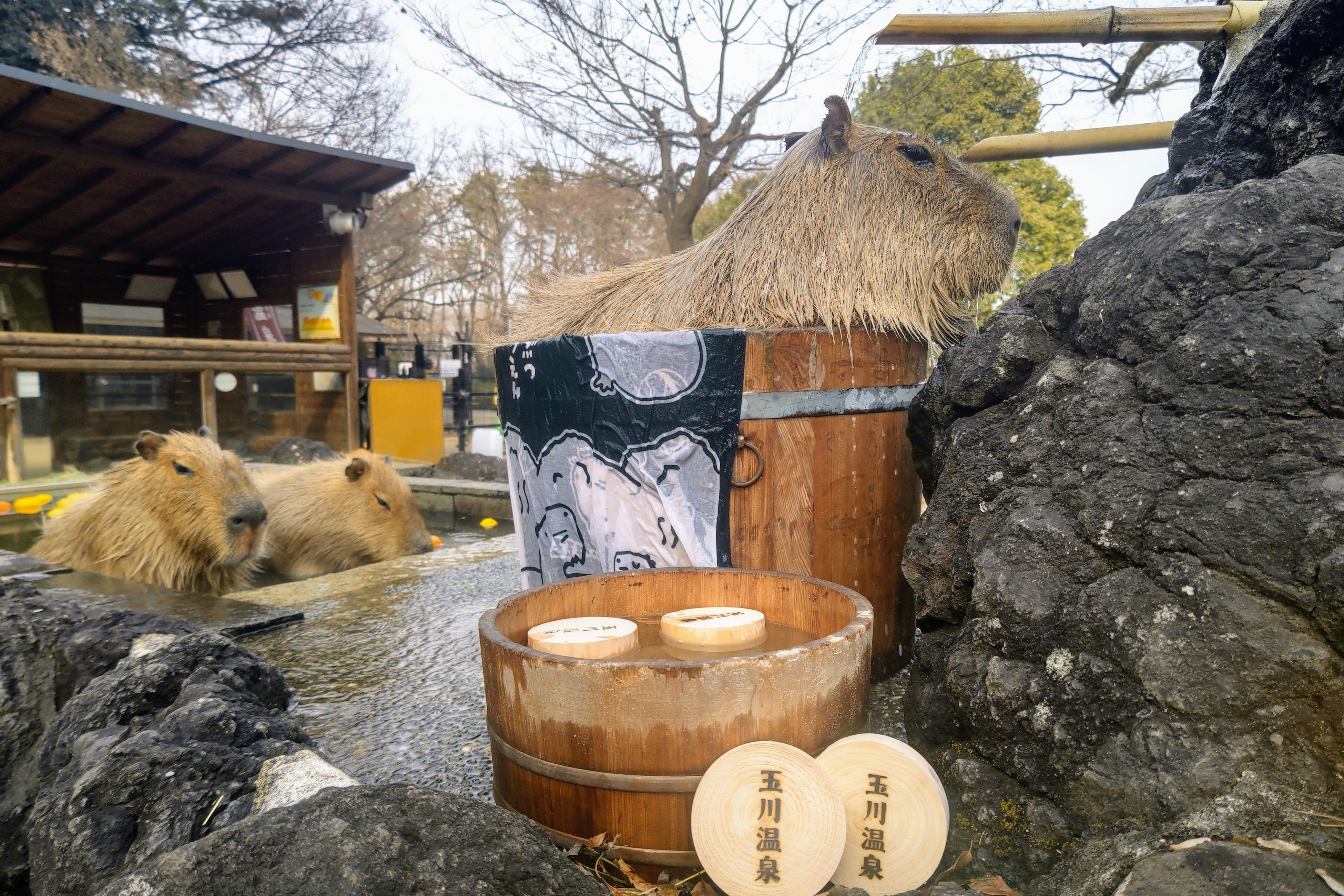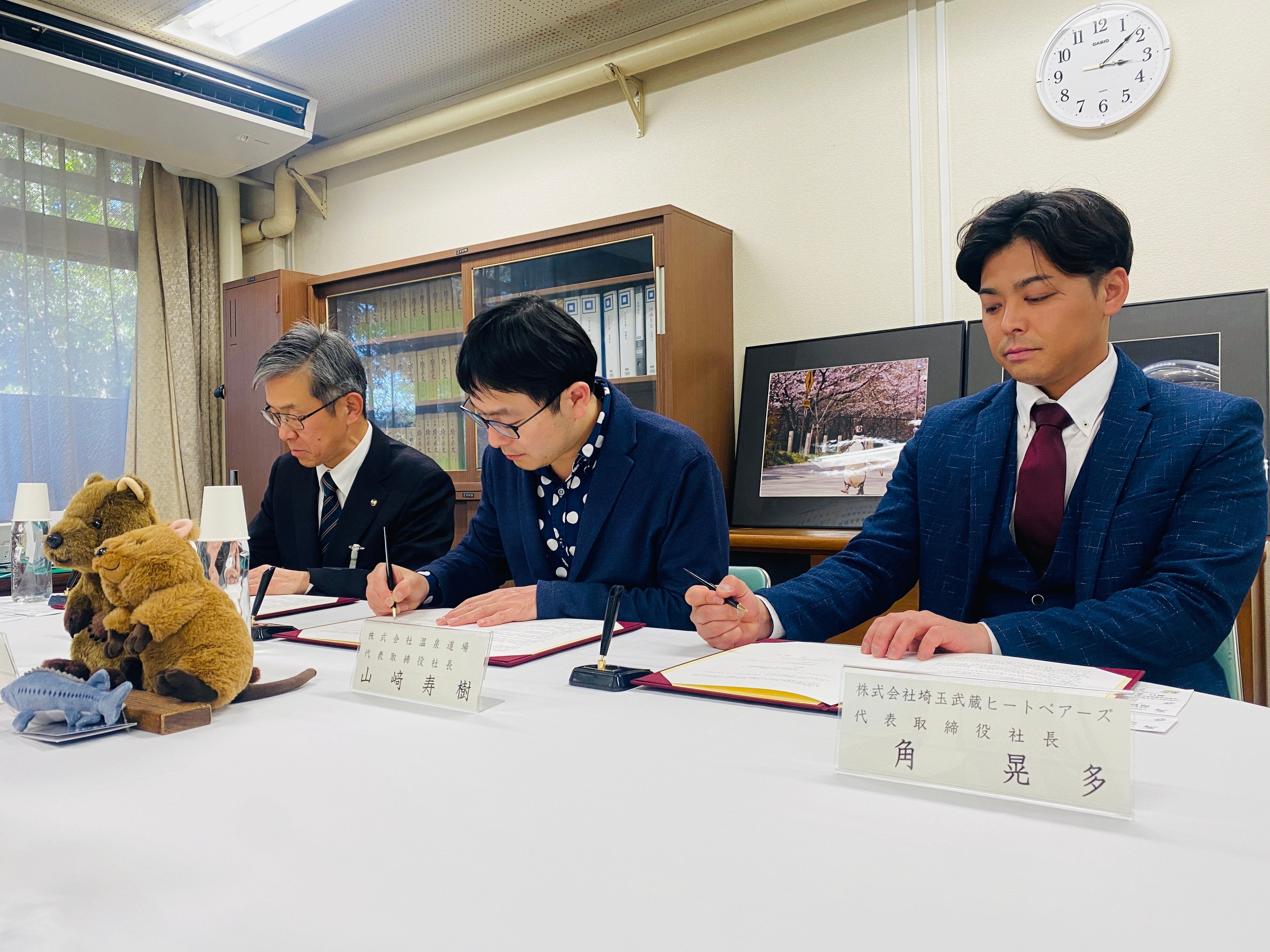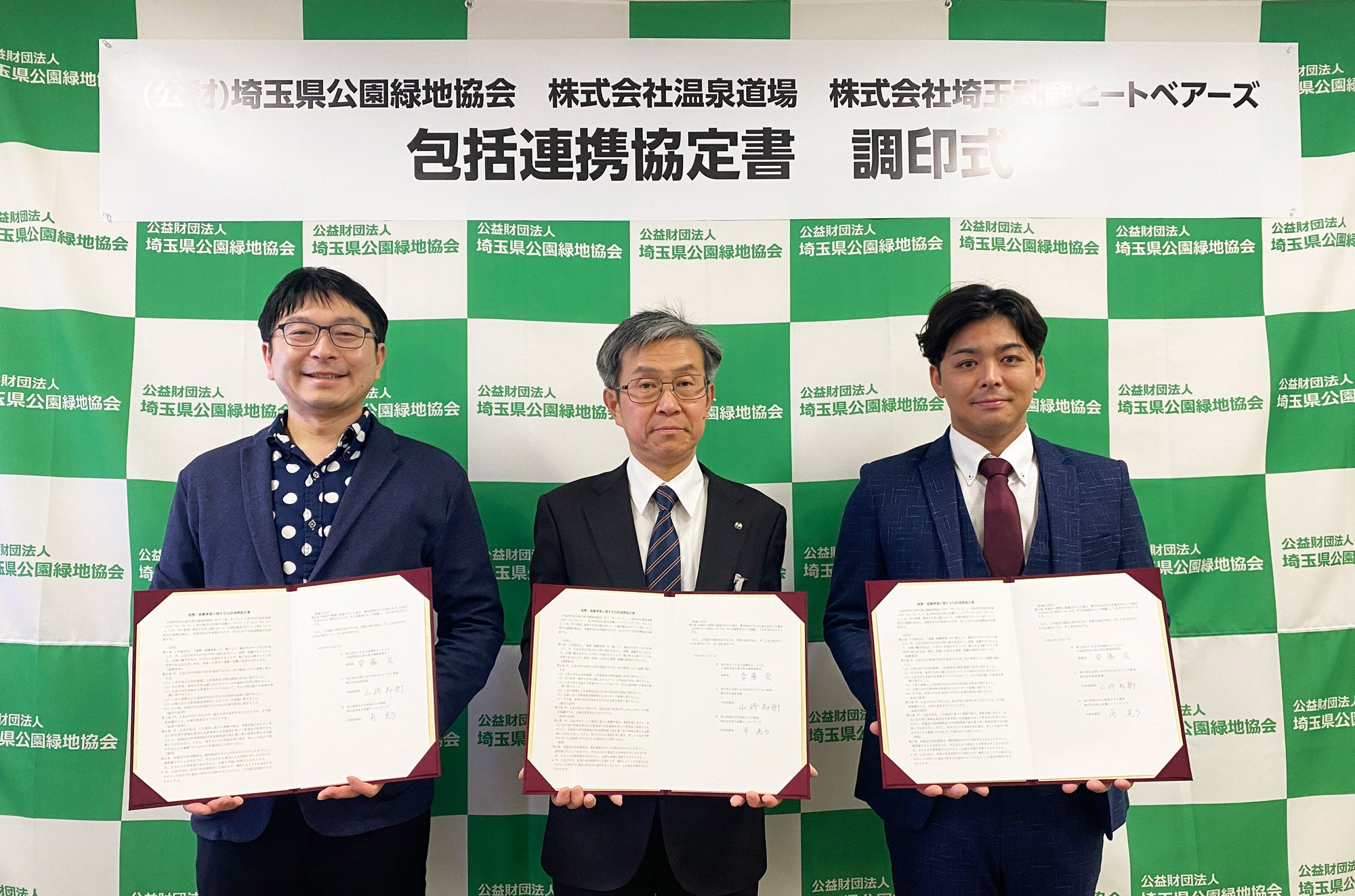 (写真は左から、株式会社温泉道場 代表取締役 山﨑寿樹、埼玉県公園緑地協会 理事長 安藤宏氏、株式会社埼玉武蔵ヒートベアース 代表取締役 角晃多)