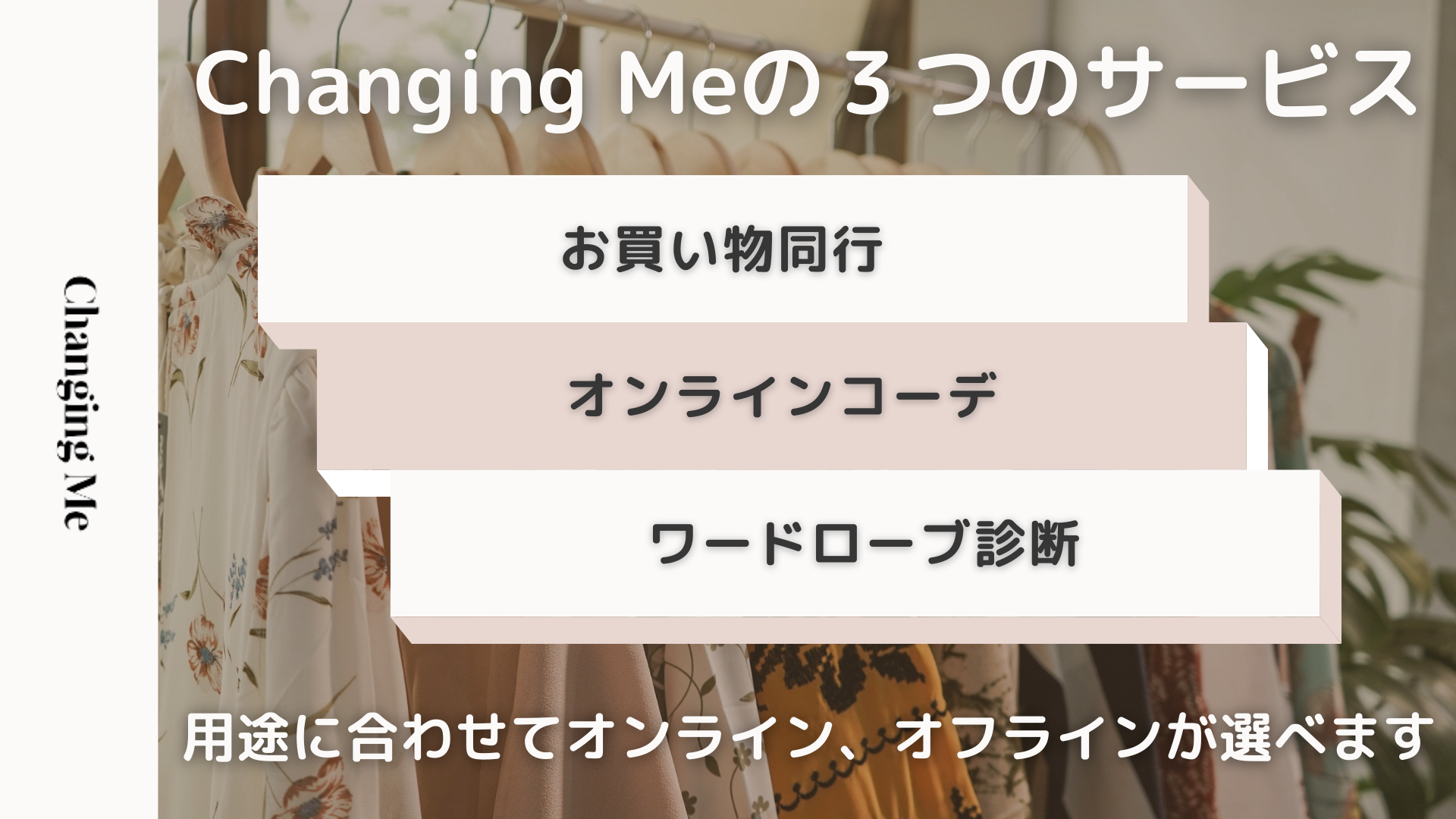 Changing Meは、買い物同行サービスの他に、ワードローブ診断、ヘアメイク提案など幅広いメニューを用意しております。