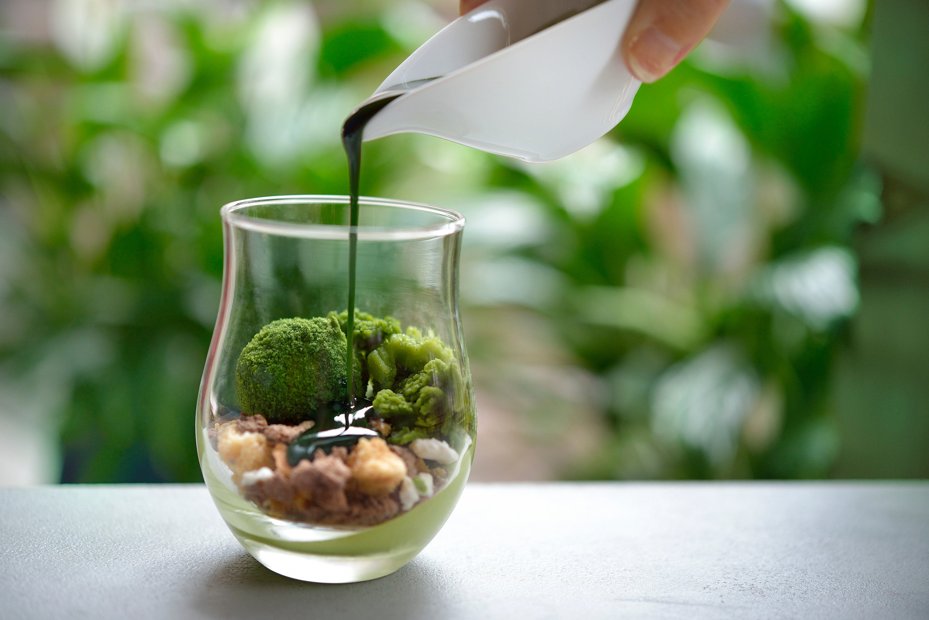 苔玉のテラリウムをイメージしたグラスパフェ。抹茶とホワイトチョコレートのムースに、ザクザクとした食感が楽しめるクランブルのほか、ビターチョコレートとホワイトチョコレート、濃淡をつけた2色の抹茶あん、パンナコッタをのせて世界観を表現しました。苔玉を模したパンナコッタは味のアクセントとしてライムとレモンピールを閉じ込めた爽やかな一品で、お口直しとしてもお召し上がりいただけます。「辻利兵衛本店」のレシピで作るお濃茶ソースをお好みでかけて、宇治抹茶の味わいを存分にお楽しみください。