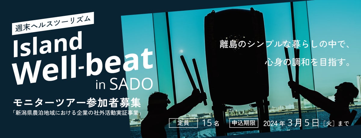 週末ヘルスツーリズム「Island Well-beat in SADO」は、離島・佐渡島に集い、島の自然の中で心身の調和を取り戻し、ストレス緩和や生産性、クリエイティビティやチームワークの向上を目指す1泊2日のツアーです。