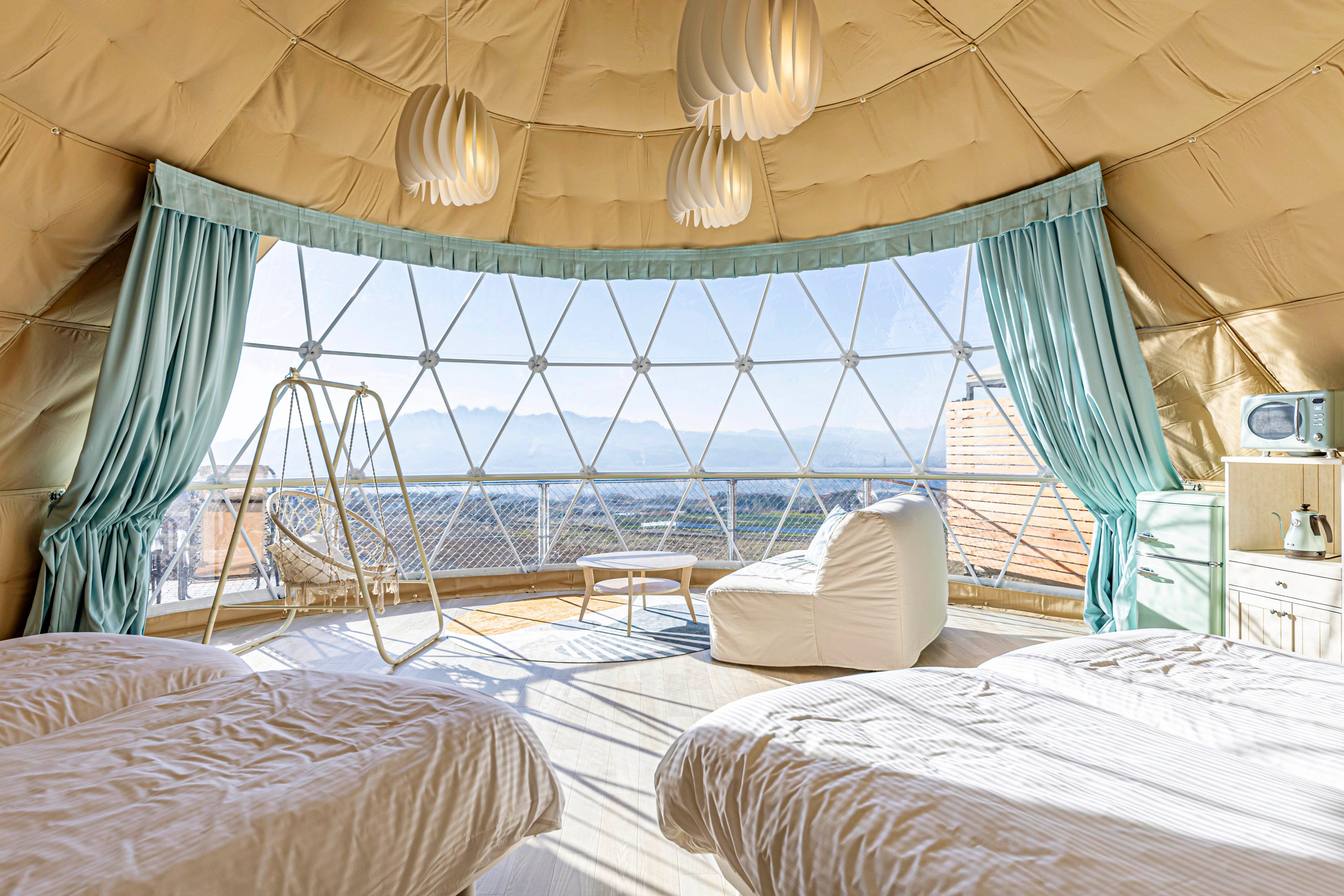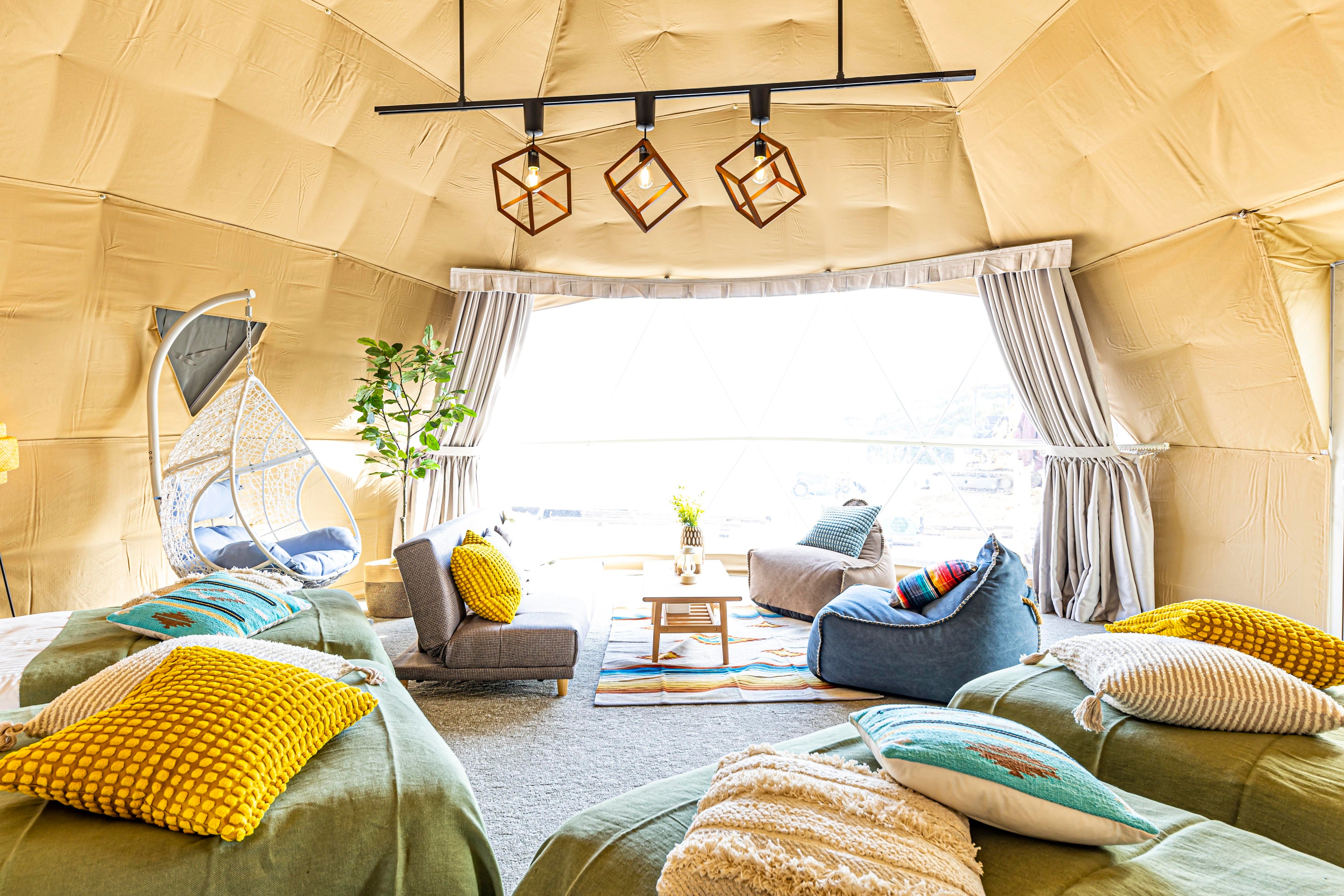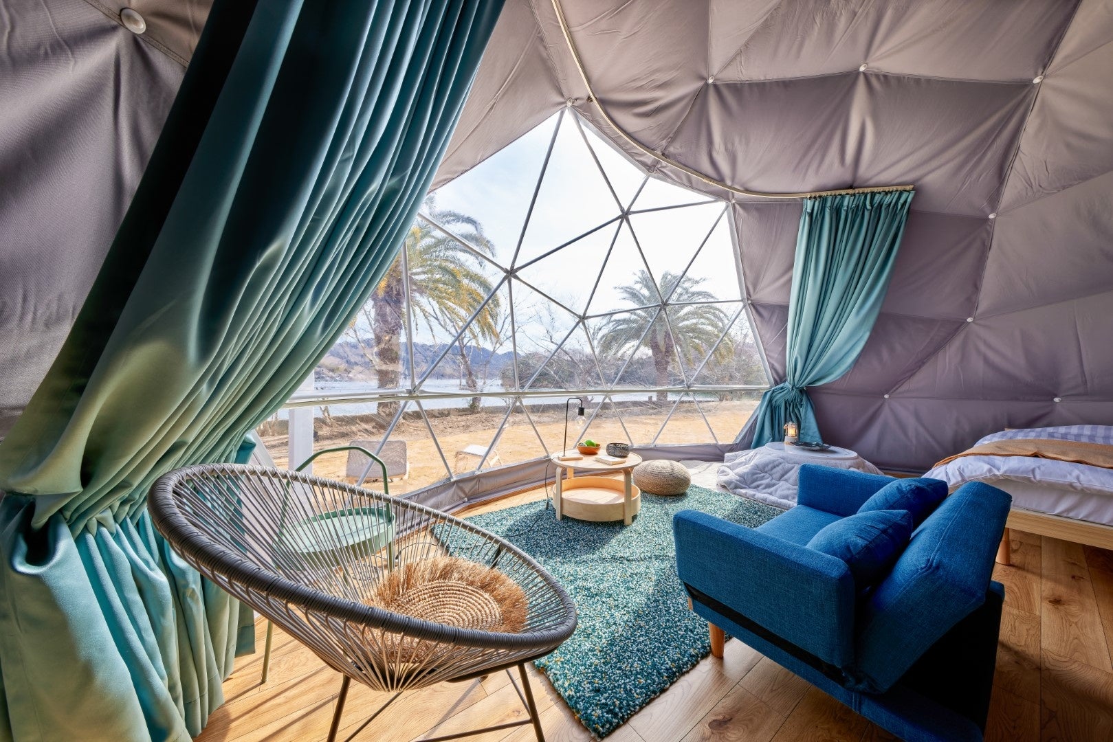 全13棟、5種類の客室タイプから自分の滞在スタイルに合った客室を選ぶことができる、『リバーサイドグランピング猪名川』。その中でも桜を見たい方に一番おすすめなのが、2棟限定のアクアドーム【sakura】のお部屋です。