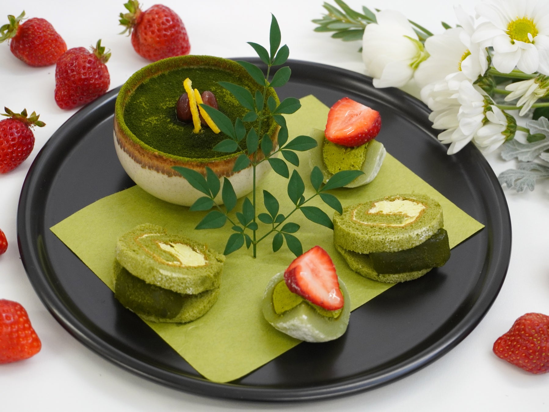 鮮やかなグリーンが目を惹くミドルティアは、抹茶の奥深さを余すことなく味わえる一皿です。柚子がアクセントのティラミスや、モチモチのわらび餅をサンドしたロールケーキなど、パティシエ独自の解釈で和を取り入れたスイーツが並びます。