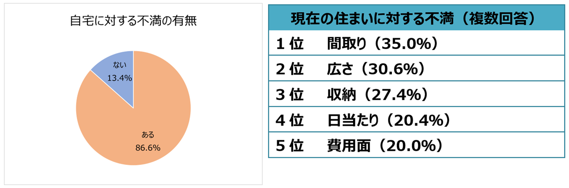 ① 8割以上は自宅に何らかの不満あり!不満1位「間取り」 2位「広さ」 3位「収納」