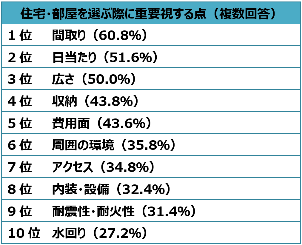 かなり多くの人は自宅に何らかの不満があることが分かりましたが、それを踏まえ、選ぶ際に重要視すべきだと考えている点についても質問したところ、6割以上が「間取り(60.8%)」と回答。「日当たり(51.6%)」「広さ(50.0%)」と回答した人も5割を超えています。室内に関する内容のほかに、「費用面(43.6%)」、学校が近い、買い物がしやすいといった「周囲の環境(35.8%)」や「アクセス(34.8%)」などにも回答が集まり、外部的な要因も重要視すべきだと考える人が多くいました。