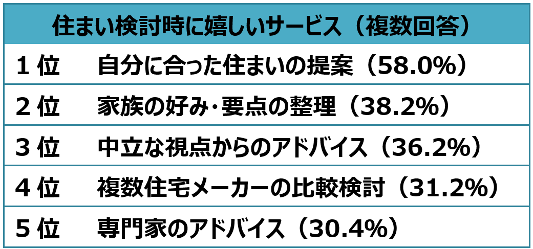 住まい検討時にあったら嬉しいサービス「自分に合った住まいの提案」「家族の好み・要点の整理」