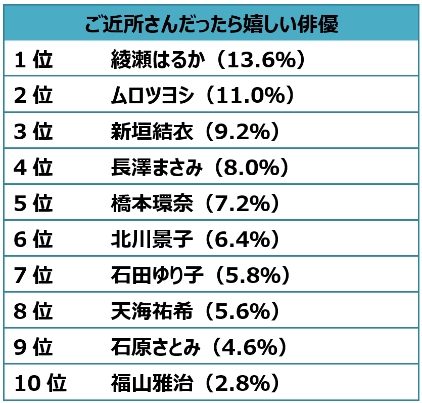 最後に、ご近所さんだったら嬉しい俳優を回答してもらいました。その結果、綾瀬はるかさん、ムロツヨシさん、新垣結衣さん等が男女問わず多くの票を集めました。ドラマや映画、CMに多数出演し活躍している方々がランクインし、人気の俳優の皆さんが支持されました。回答者を女性に限定した場合のトップ3は、1位ムロツヨシさん、2位綾瀬はるかさん、3位天海祐希さん。男性に限定した場合は、1位綾瀬はるかさん、2位新垣結衣さん、3位長澤まさみさんという結果に。また、選んだ理由についてもアンケートを実施したところ、親しみやすい、面白そう、穏やかそうといった意見が目立ちました。