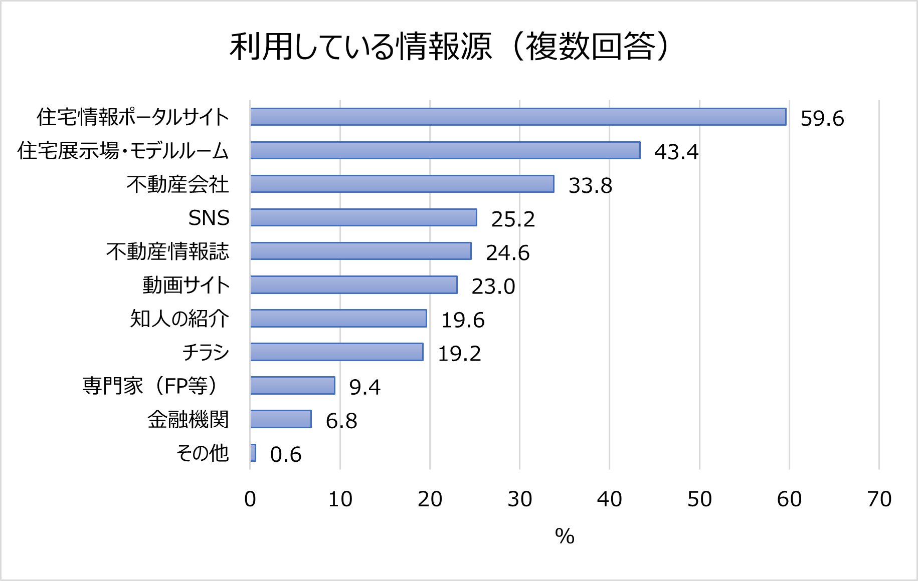 住宅を選ぶ際に最も利用されている情報源は「住宅情報ポータルサイト(59.6%)」でした。「SNS(25.2%)」や「動画サイト(23.0%)」を利用している人も多く、オンライン上のツールが上位に入りました。一方で、2番目3番目に回答が多かった「住宅展示場・モデルルーム(43.4%)」や「不動産会社(33.8%)」など、住まい選びとなると実際に足を運んで情報収集する人も多くいるという結果に。