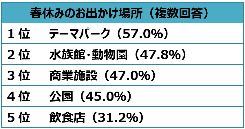春休みのお出かけ場所ランキング 1位「テーマパーク」 2位「水族館・動物園」 3位「商業施設」