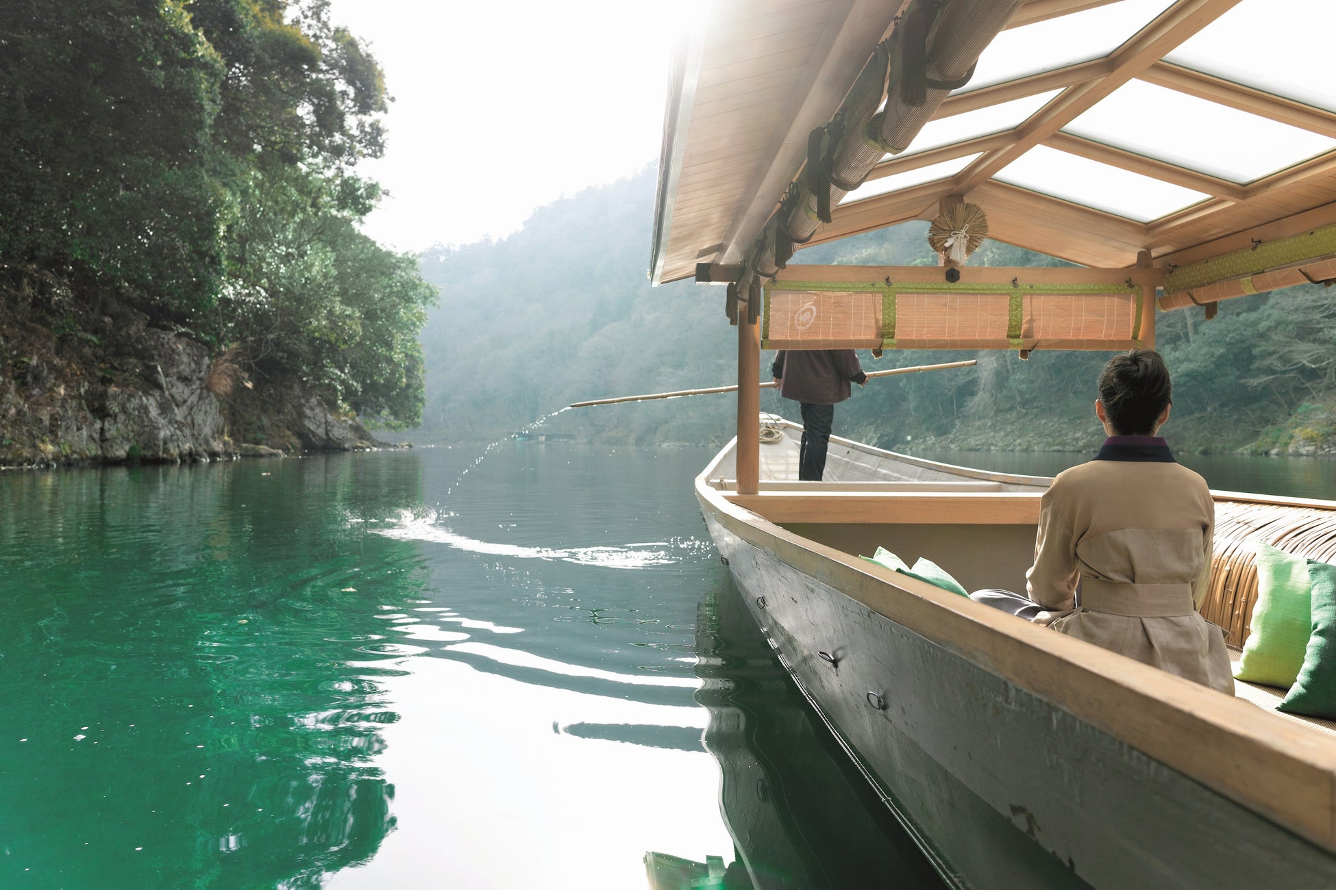 星のや京都が位置する奥嵐山は、かつて平安貴族が四季の渓谷の風景を愛でながら舟遊びを楽しんでいた*2風光明媚な場所です。早朝の静かな時間帯には、春の陽に照らされる川や日々色を増す若葉が織りなす嵐峡の自然に抱かれます。星のや京都専用の屋形舟「翡翠」を貸し切り、川との一体感を得られる贅沢な時間を過ごしてほしいと考えています。