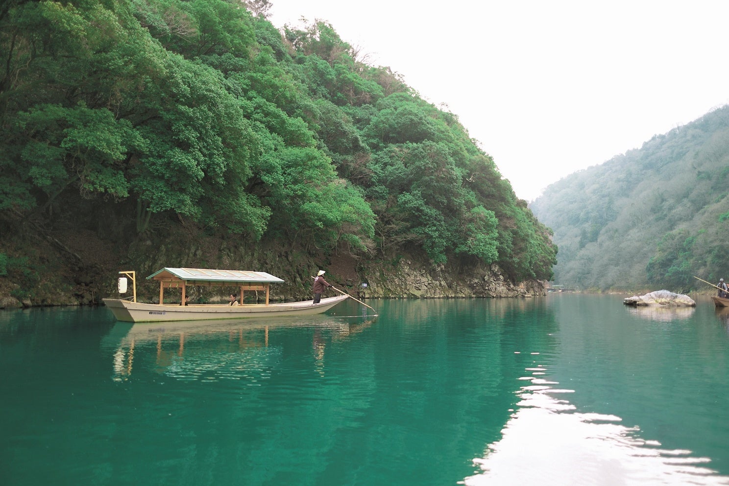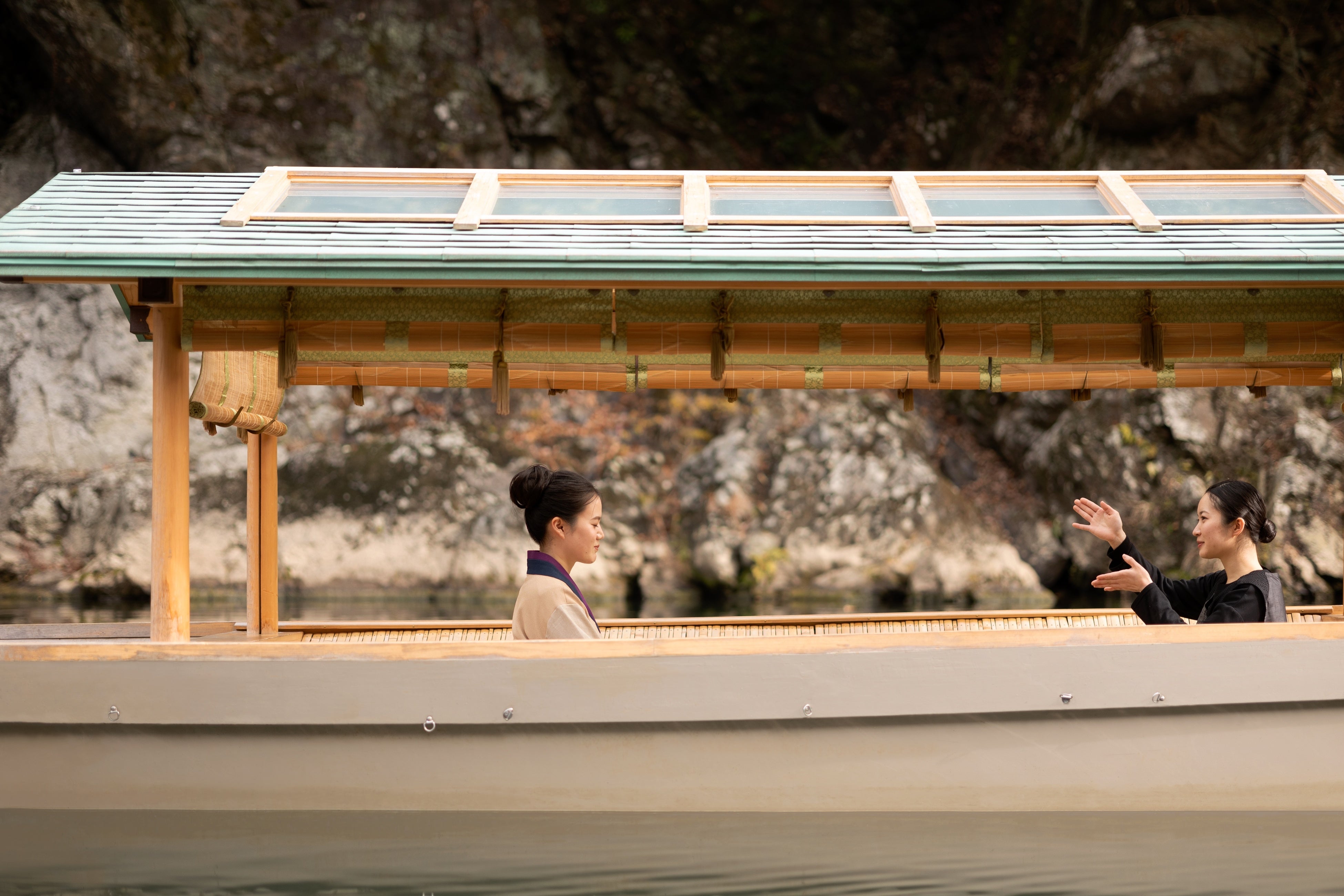 星のや京都が位置する奥嵐山は、かつて平安貴族が四季の渓谷の風景を愛でながら舟遊びを楽しんでいた*2風光明媚な場所です。早朝の静かな時間帯には、春の陽に照らされる川や日々色を増す若葉が織りなす嵐峡の自然に抱かれます。星のや京都専用の屋形舟「翡翠」を貸し切り、川との一体感を得られる贅沢な時間を過ごしてほしいと考えています。