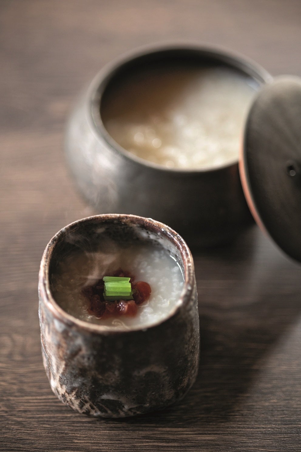 身体を動かした後は、総料理長特製の梅粥を味わいます。お粥は、鰹と昆布の出汁でふっくらと仕上げ、梅と三つ葉の茎を合わせました。嵐峡に響く鳥のさえずりや川の音を聞き、芽吹きのエネルギーを感じながら梅粥を味わうことで、内側からゆっくりと身体を目覚めさせます。