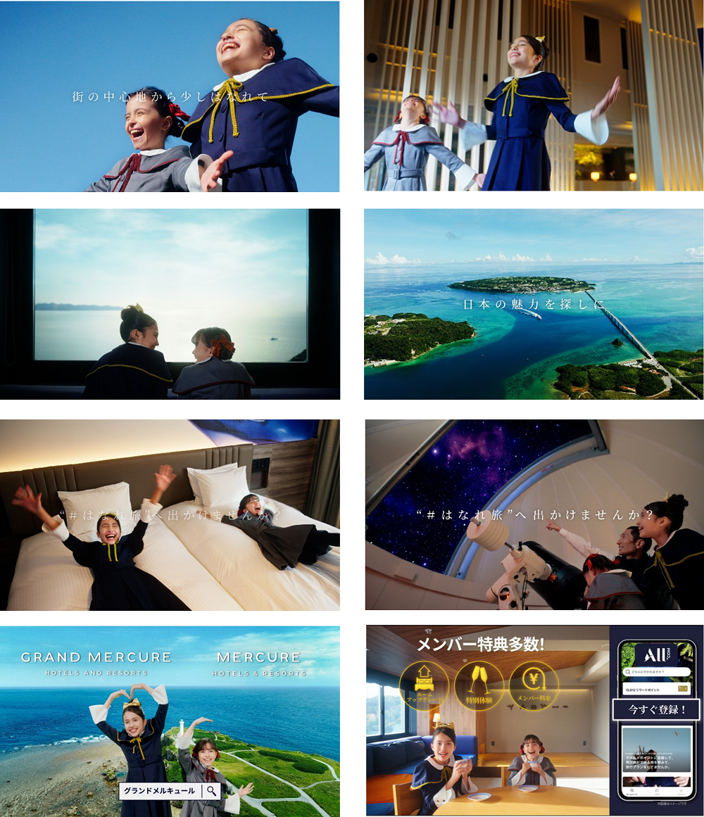 本CMでは、今回開業する、「グランドメルキュール」「メルキュール」について紹介するナビゲーターとして、メルルちゃんとキュールちゃんと名付けた2人の姉妹を起用しました。街の中心地から少し離れた、日本全国のまだ見ぬ絶景や体験を楽しむ「#はなれ旅」を紹介します。ホテル近辺には、広々とした海や空、荘厳な山々など、まだあまり知られていない豊かな自然があふれており、四季折々、昼夜さまざまな自然の表情に出会えます。「グランドメルキュール」では、館内に入るとその土地を感じる香りに包まれたり、地元の食材を使った食事が楽しめたりなど、五感でその土地の魅力を楽しむことができます。日本全国の「#はなれ旅」に是非ご注目ください。