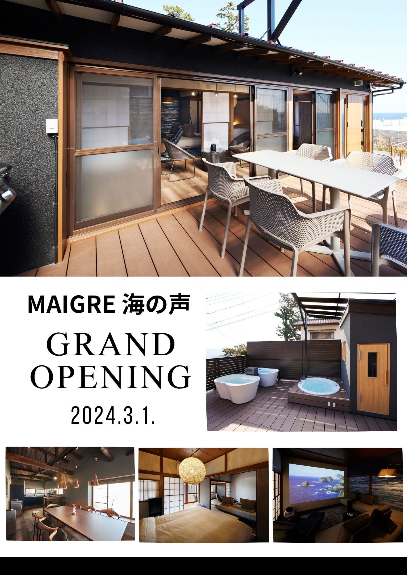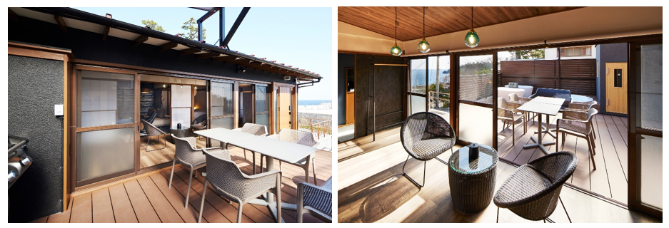 本貸別荘「海の声」の名のもと、波の音や鳥の声が心地よく感じられる縁側や、日本家屋の良さを活かしたインテリアでお寛ぎいただける空間に仕上げており、眼下に広がる海と波の音、カモメの声を聞きながら、サウナやジャグジー、露天風呂を満喫いただけます。
