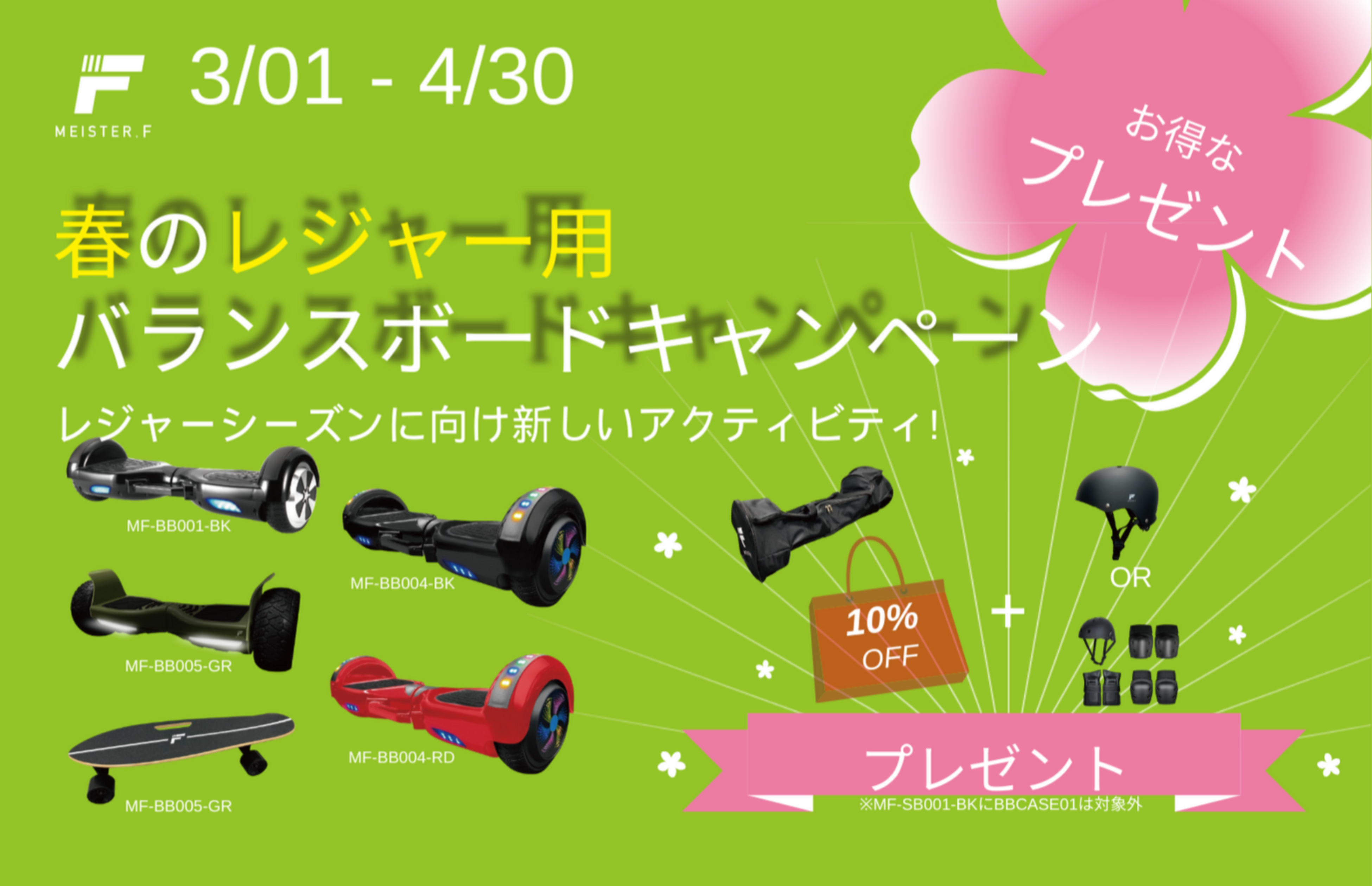 外遊びの新アイテム!電動セルフバランススクーター を期間中、特別価格で販売。さらに、購入後すぐに乗る練習ができるヘルメット or キッズプロテクター とキャリーバッグをプレゼント。