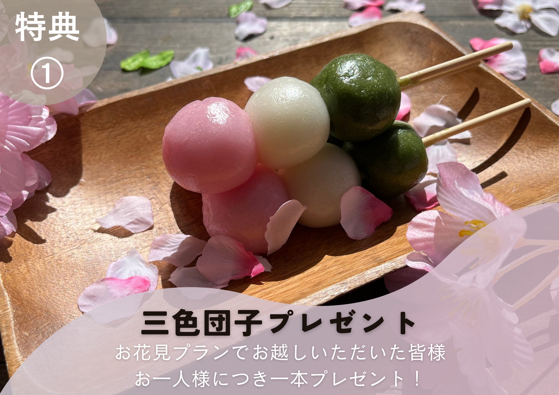 お花見に欠かせない三色団子。お越しいただいた皆様に、一人一本ずつプレゼントいたします。