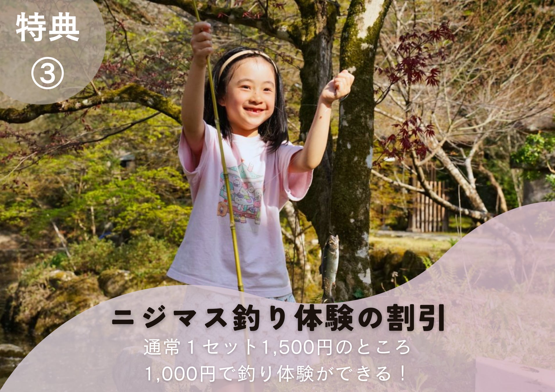 ▪️三色団子のプレゼント、アルコール飲み放題およびマス釣りの割引